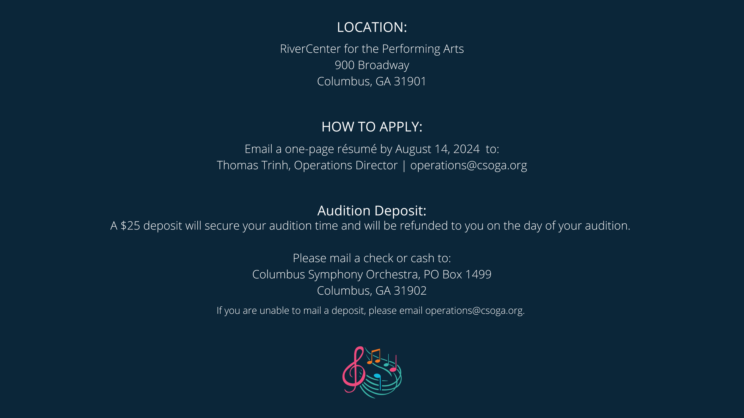 Equal Employment Opportunity Statement: The Columbus Symphony Orchestra provides equal employment opportunities to all employees and applicants, regardless of an individual's race, sex, sexual orientation, color, religion, age, disability, or national origin. It is the CSO's policy to recruit, employ, retain, promote, and otherwise treat any and all employees and job applicants on the basis of qualifications and competence. All hiring practices of the Columbus Symphony Orchestra will comply with applicable laws or regulations concerning equal employment opportunity.